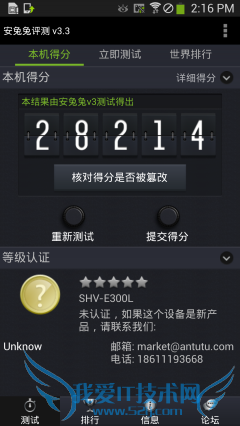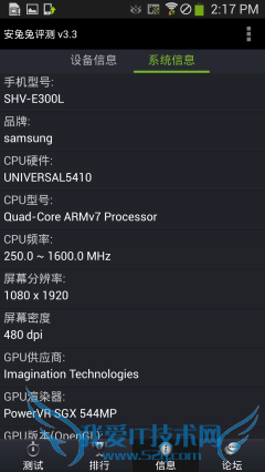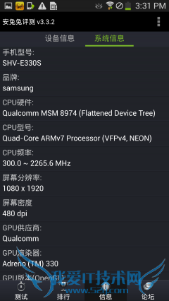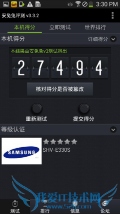 安兔兔系统评测AnTuTu Benchmark是一个专门给Android系统的手机、平板电脑硬件跑分的软件,它能一键运行完整测试项目,通过内存性能、CPU整数性能,CPU浮点性能、2D、3D绘图性能、数据库I/O、SD卡读、写速度等多项性能测试,并对手机的整体和单项硬件性能做出评分,同时上传分数并查看该设备在世界的排名。据说骁龙800的跑分可以轻松上3万分,但我们经过多次测试,搭载骁龙800 MSM8974的三星GALAXY S4 LTE-A,把机器跑的烫手了都没有达到3万,总共进行了5次跑分测试,最高一次成绩为27494分,其余都在22000-24000之间徘徊。而搭载三星 Exynos 5 Octa 5410处理器的三星S4跑分成绩可以很稳定的保持在28000分左右。