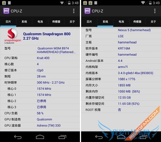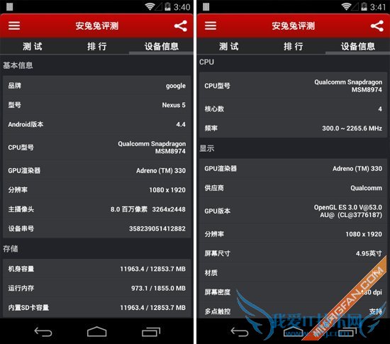 LG Nexus 5的硬件配置是:4.95英寸1080P分辨率屏幕;高通骁龙800四核处理器、主频2.3GHz;GPU Adreno 330、2GB RAM+16/32GB ROM。此外笔者还用软件检测出了该机的设备信息,更多内容可以查看以下图片。