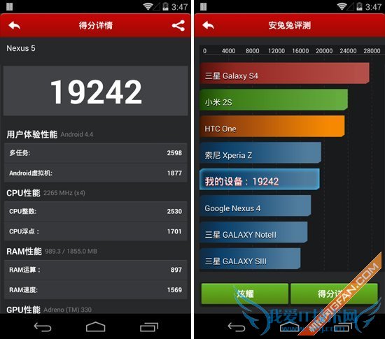 性能总结:虽然LG Nexus 5在硬件上的配置非常彪悍,采用了骁龙800四核处理器,但在软件测评中的表现却很不理想,安兔兔跑分仅仅只有19242,让笔者对其非常失望。