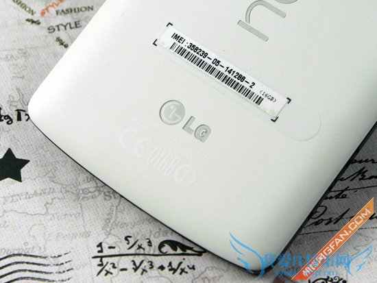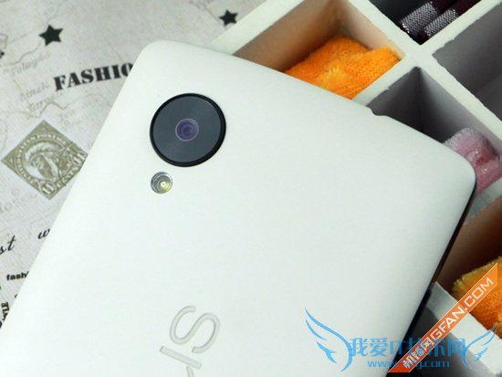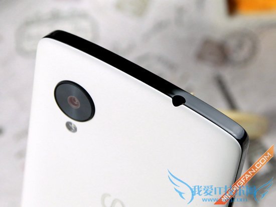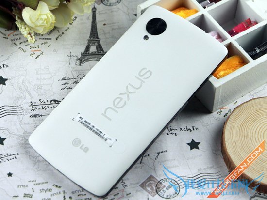 机身背面采用一体式设计,后盖采用白色塑料材质、无法拆卸。上方是800万像素的主摄像头,中间是Nexus品牌标志,下方是LG的产品标志。