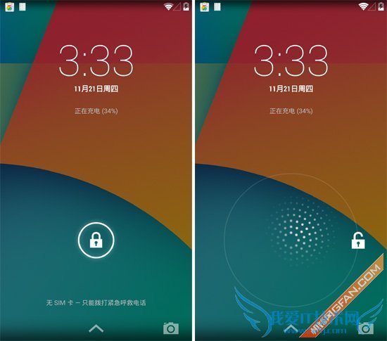 在锁屏界面下,Android4.4的锁屏界面有了新的修改,除了显示时间、日期外,左右滑动屏幕还可以开启应用快捷入口。在屏幕右下角有相机应用的快速开启按钮。