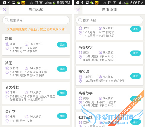 在选择完学校院系之后,我们就可以开始添加课表了,我们还是先来看看课程格子,在添加课表的时候,课程格子会为大家显示出很多的课程,这其中除了必须课外,就连一些学生会或者是课余的选修课都能显示出来,虽然这并不是所有的课程,但是总体来说还是非常全面了。