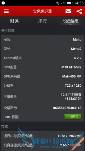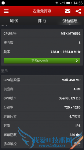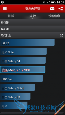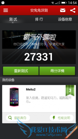 虽然美图手机2的主要特色并非性能,但厂商对性能这块似乎也并没有放松,从配置上来看,美图手机2采用了联发科MT6592 1.7GHz八核处理器,搭配2G RAM+16G/32G ROM组合,虽然并没有达到目前顶级一线旗舰标准,但其性能却足以满足目前市面上所有应用、游戏的运行需求,不过下面我们还是需要通过简单的跑分来测试一下,以满足大家对手机性能量化的需求。