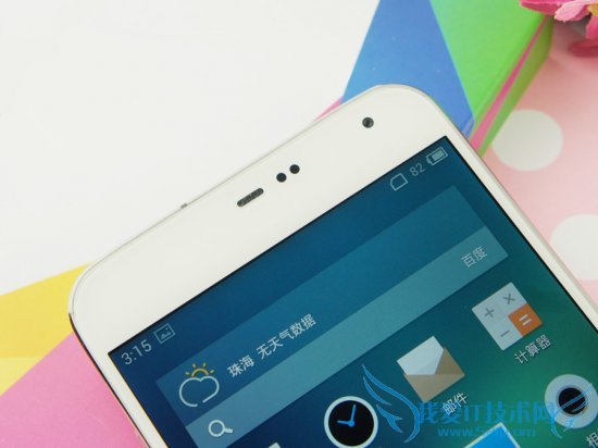 正面顶部中间位置是听筒设计,有金属保护网可以有效减少灰尘进入,右侧是前置摄像头。位置与黑色版一样,但看起来白色版MX3的听筒和摄像头更为明显。