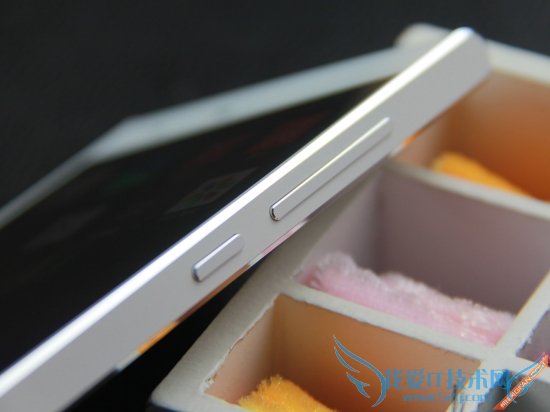 音量与电源按键位于机身右侧,材质同样为金属,在按压时的感觉十分清脆,表现良好。同时电源按键的位置设计的十分合理,正常大小的手掌拇指可以轻松覆盖到电源按键上。
