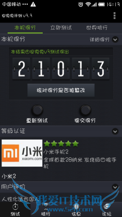 安兔兔评测是一个专门给Android系统的手机、平板电脑硬件跑分的软件,它能一键运行完整测试项目,通过内存性能、CPU整数性能,CPU浮点性能、2D、3D绘图性能、数据库I/O、SD卡读、写速度等多项性能测试,并对手机的整体和单项硬件性能做出评分。同时上传分数并查看该设备在世界的排名。小米手机2S安兔兔测试成绩为25245分,小米手机2安兔兔测试成绩为21013分,小米2S“跑分小王子”的称号实至名归。