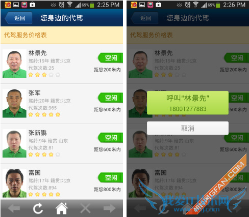 如果平时我们出去应酬,难免会喝酒,但是酒后驾车是非常危险的,这时我们就可以通过软件查询附近的代驾,谁处于空闲状态,谁正在接活都可以一一查询到。我们只要点击空闲的司机,电话就会显示出来,方便我们快速的进行联系。