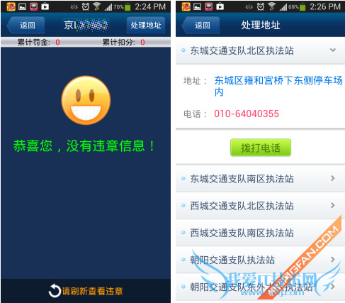 如果真的出现了违章信息我们也不用担心,通过点击屏幕又上角的处理地址,我们可以搜索到距离你最近的处理点,然后点击进去,搜索到地址以及电话,方便大家快速处理自己的违章记录。