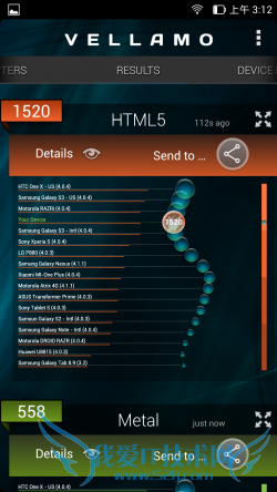 Vellamo是由Qualcomm(高通公司)开发的一个基准测试应用(类似于Neocore),它可以让你对手机浏览器的性能及稳定性进行测试,包括像Java脚本性能、渲染、联网和用户界面等。该工具的结果同样包括多个子项,但我们只取总成绩,分数越高则表明手机对浏览器的优化程度越高,网页浏览体验更好。