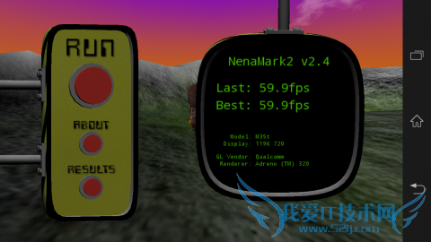 NenaMark2是一款实时渲染的画面来对手机的测试软件,在测试中,我们可以看索尼M35t测试帧数为59.9fps,可以满足绝大部分游戏的运行需求。