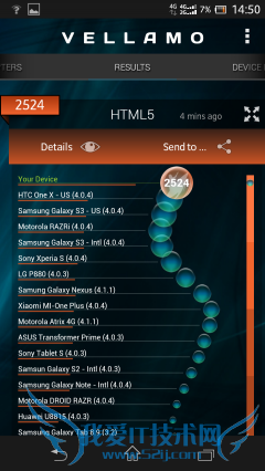 在Vellamo测试项目中,索尼M35t的MTML5分数为2524分,在机型对比中,属于主流水平。而相对联发科四核MT6589处理器的分数要高出很多。