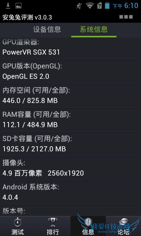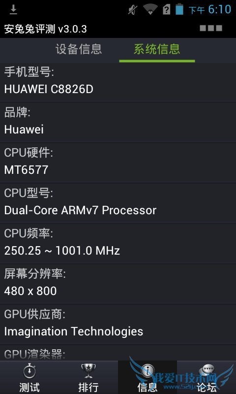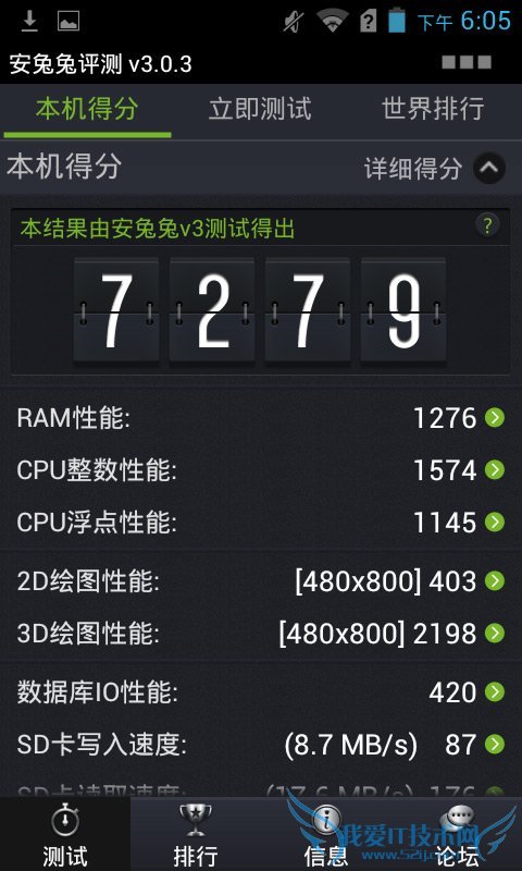 安兔兔系统评测AnTuTu Benchmark是一个专门给Android系统的手机、平板电脑硬件跑分的软件,它能对手机的整体和单项硬件性能做出评分,同时上传分数并查看该设备在世界的排名。华为G500C此项评测跑分7279分,与其他几款双核设备相差不多。