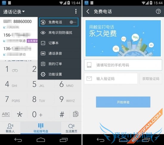 前文中也有提到,免费电话是在软件原有基础上新增的一项功能,点击右上角的菜单按钮,如下图所示点击蓝色框中的“免费电话”来开启该功能,接着输入手机号码,获取短信验证码即可,与微话不同的是它无需用户设置登录密码。而用户在触宝电话中输入手机号,则是为了在网络通话的过程中可以显示对方或者是自己的手机号码。