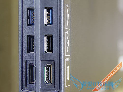 虽然官方的介绍中对USB接口的规格没有进行详细说明,但是通过对USB接口颜色的观察,可以看出两个USB口中触点板的颜色不同,而且有一个呈USB3.0惯用的深蓝色,推断两个USB口中有一个为USB3.0的接口。