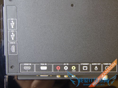 小米电视配备了较为主流的外设接口,支持双USB、双HDMI、单VGA、AV、以太网、以及有线电视讯号的接入,并支持蓝牙4.0协议,以及无线网卡。除电源接口外,其他接口均设计在机身右侧的后背板上。较为常用的USB与一个HDMI接口设计到了侧面,方面日常的插拔使用。