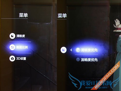 在播放网络视频时呼出菜单后可以发现与TV中不同的选项菜单,其中有兼顾流畅度与清晰度的选项,在用户网络状况不佳时,可以通过这个选项保证影片的正常播放。这个设计还是十分贴心的。