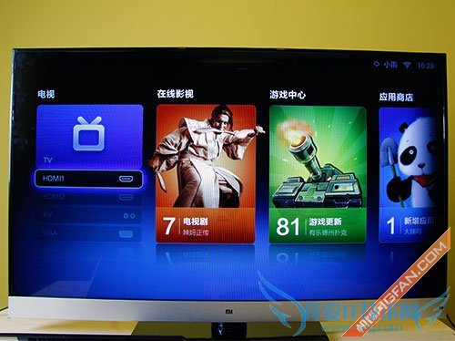 既然名为小米电视,自然主打的是电视播放功能。TV版MIUI采用了类似Windows Metro的排列方式,但是相比Metro而言每个项目的展示更加立体化,通过接入有线电视天线,用户可以在TV项目中观看有限电视。