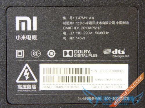 通过小米电视背板上的标签可以看出这款小米电视功耗为145W,与目前市面上销售的47英寸电视110W至130W的功耗相比,稍大了一些,但是每小时0.145度的耗电量,与普通电视相比相差无几,基本在可接受范围之内。另外还可以明显的看出小米电视支持DOLBY(杜比)音响效果以及dts数字化影院系统。对于影像效果的展现自然有所保证。
