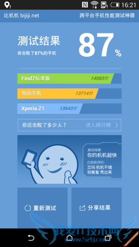 比机机提供完整的手机性能测试,包括基准测试和图形测试,并在测试完成后给出评分,并提供分享功能,可以分享到社交网络。