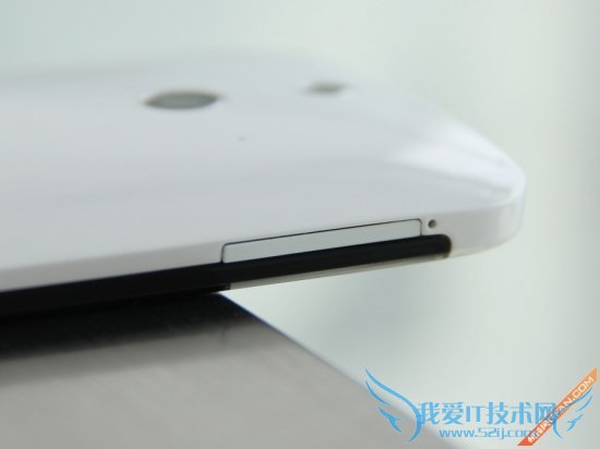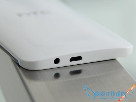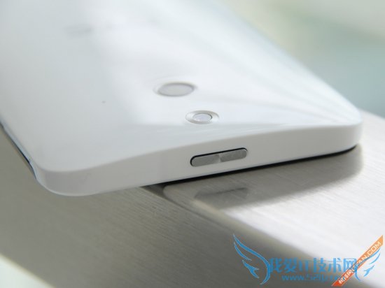 再来看看细节部分,机身顶部为电源键,被安置在了正中央,并没有红外功能。HTC坚持着自己的想法,依旧不肯妥协将电源键移至机身右侧,这无疑对大屏来说是个不小的灾难。但依靠内置传感器,HTC One时尚版无需按下电源键,通过手指与屏幕的接触即可点亮屏幕。