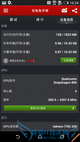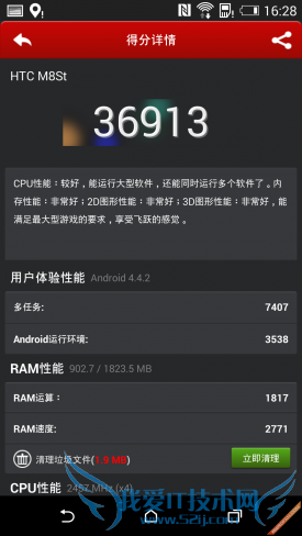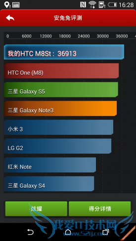 HTC One时尚版搭载了一颗主频为2.5GHz的高通骁龙Snapdragon 8974AC四核处理器,并配合使用了2GB的运存空间,硬件整体配置绝对算得上是旗舰级别。在这样的硬件配置保证下,系统的运行非常流畅,不管是处理一些简单的应用还是运行一些大型的3D游戏,都能应付的游刃有余。硬件配置只是其中一部分,下面我们通过实际跑分软件进行测试,以满足大家对手机性能量化的需求。