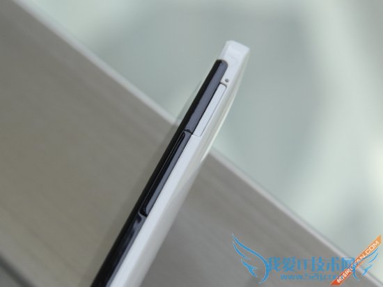由于时尚版采用一体机身设计,后盖同样不能拆卸,所以插拔 SIM 卡和扩展内存就只能利用卡槽了。机身左侧为nano SIM卡槽,而机身右侧上方为micro SD卡槽,偏下一点的位置是隐藏式音量调节键,与黑色边框融为一体。