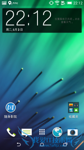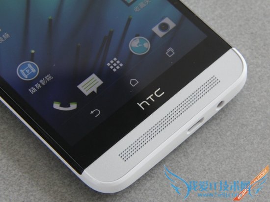 机身正面下方为HTC的LOGO,将虚拟按键放置屏幕内部,占据了一定的空间,并且在主页显示时,常驻应用、虚拟按键、HTC LOGO和扬声器将整个屏幕下半部分分割成了四部分,看起来像拥有一个长长的下巴,有些头轻脚重的感觉。