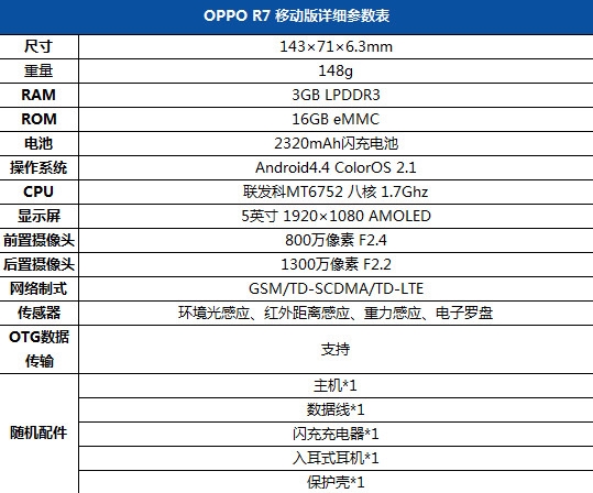 配置方面,OPPO R7算不上顶级,但也不落伍。移动版搭载了MTK MT6752 1.7GHz八核64位处理器,搭配3GB内存,GPU是ARM Mali-T760MP2 ,其频率达到了600MHz,在1920x1080分辨率下的屏幕刷新率可达到60fps,最高支持1600万像素摄像头,封装集成移动/联通4G-LTE基带。