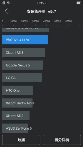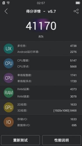根据天极网的测试,OPPO R7安兔兔跑分达到41170分,算是中等偏上:其中多任务的得分为4738,CPU整点得分为5147,单线程整数得分为1741,RAM运算得分为4373,2D绘图为1633,存储I/O得分为1633,整体得分稍次于三星的Galaxy S5。