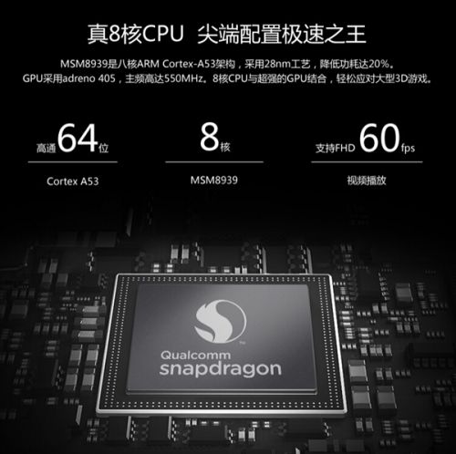 OPPO R7电信版采用骁龙610 MSM8939 1.5GHz四核64位处理器,这款处理器同样采用台积电28nm LP工艺制造,ARM Cortex-A53 CPU架构,网络制式支持LTE Cat.4 150Mbps(可选载波聚合)、DC-HSPA+、CDMA、TD-SCDMA。而GPU方面则采用新一代Adreno 405,支持OpenGL ES 3.0,同时支持了2K分辨率的屏幕和H.265视频解码,并能支持最高2100万像素摄像头。