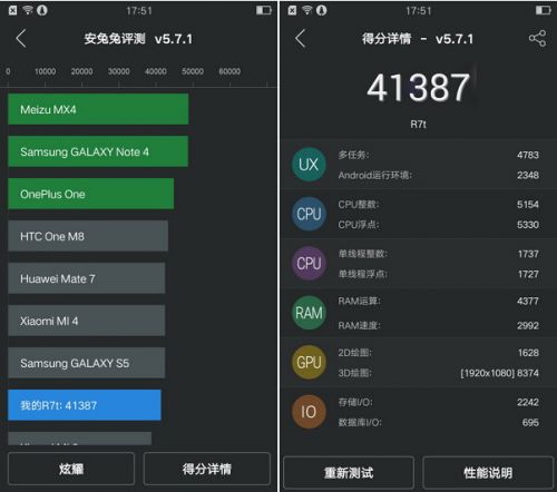 使用了联发科八核处理器MT6752,这款处理器大家已经很熟悉了,在其它产品当中也验证了其性能,图形核心为Mail-T760。从成绩上看41000多分仅次于三星去年的旗舰手机S5,属于第二梯队中的成绩。毕竟这款R7主打并非性能,而是整体设计,所以这样的表现还是不错的。
