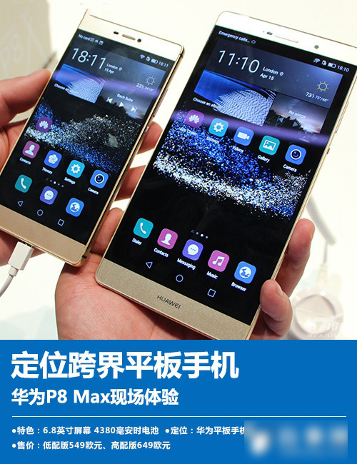 4月15日英国伦敦,华为又给我们带来惊喜,这次华为带来让人兴奋的跨界平板手机华为P8 Max。华为P8除拥有优雅工业设计、出色拍摄能力和强劲的硬件配置等基因外,作为一款MAX手机,华为P8 Max还拥有更大的6.8英寸屏幕以及更强悍的续航能力(电池容量高达4360mAh)。