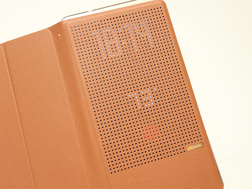 作为一款跨界平板手机,华为P8MAX推出创新点阵式皮套,保护套上的磁铁、手机内部的霍尔传感器、与Emotion UI 3.1配合实现了直接在皮套上限是时间、天气与接听电话等创新使用体验,当然这些体验在三星Galaxy Note系列和HTC等其他安卓旗舰上早已实现,只是华为P8MAX保护套并没有采用聚碳酸酯材质,而是高端大气的真皮材质,皮质触感质相当不错。为提升用户观影体验,皮套支持手机站立模式,观看视频更方面。