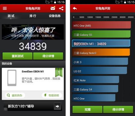 四,性能评测 作为一款售价6980元的高端商务手机,E人E本M1搭载了一枚性能强劲的高通骁龙800四核处理器(MSM8974AB),主频为2.3GHz,并配备3GB RAM和64GB超大机身内存,属于高端水准。若是采用时下顶级的高通骁龙8四,性能评测