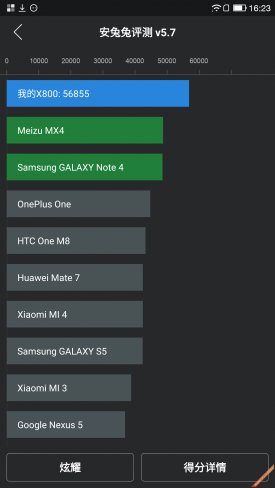 在硬件搭配上,乐视超级手机1Pro搭载了高通骁龙810八核64位处理芯片,同时搭配4GB RAM以及32GB/64GB ROM可选。从参数上来看,乐1Pro的硬件配置绝对算的上是行业顶尖水准的。但是在实际运行效果上呢?接下来我们就来通过一组跑分测试,来实际检测一下乐1Pro的硬件表现能力。