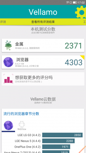 Vellamo是由Qualcomm(高通公司)开发的一个基准测试应用(类似于Neocore),它可以让你对手机浏览器的性能及稳定性进行测试,包括像Java脚本性能、渲染、联网和用户界面等。该工具的结果同样包括多个子项,但我们只取总成绩,分数越高则表明手机对浏览器的优化程度越高,网页浏览体验更好。