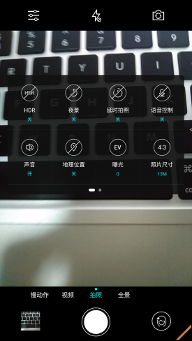 而在取景界面乐视的做法也是相当简洁,通过左右滑动便可以在拍照、全景、录像以及慢动作之间实现切换,同时在设置菜单当中还包括夜景、延时拍照、HDR、语音控制等多达15项功能可以选择。