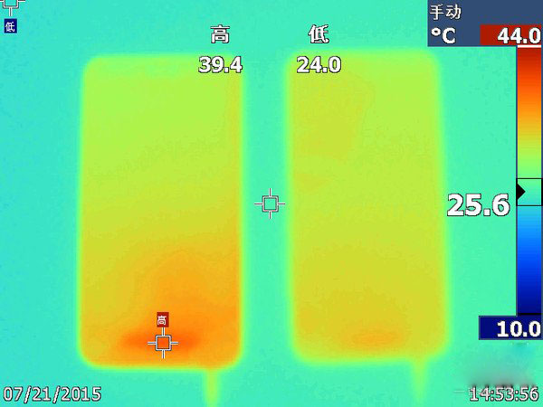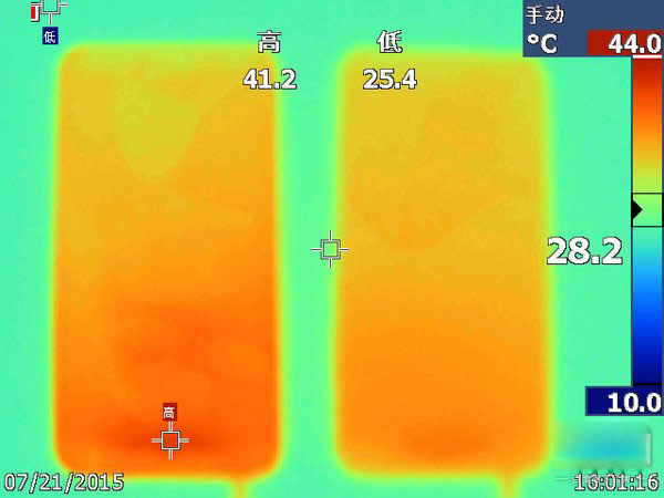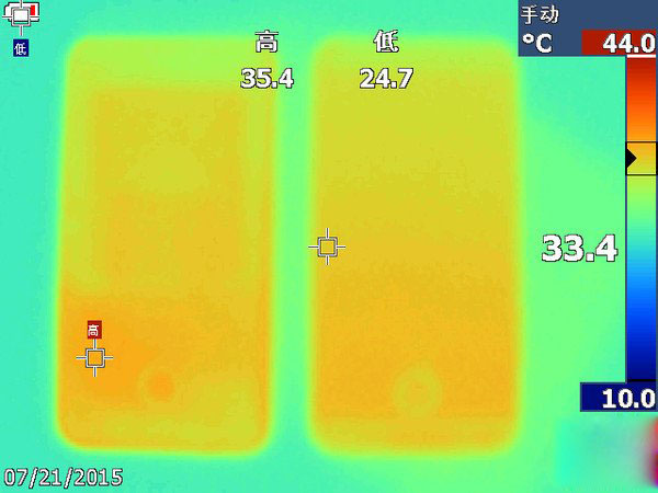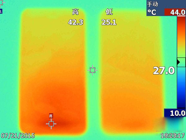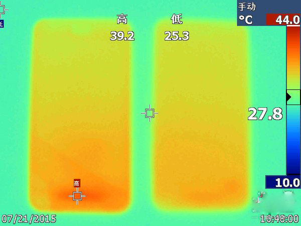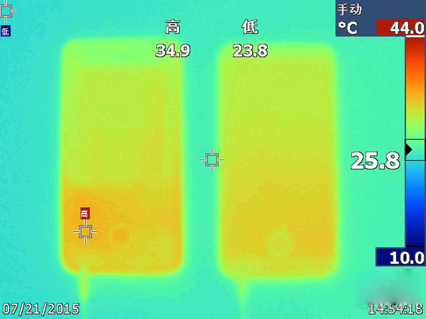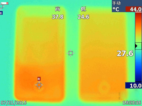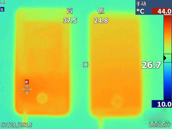 拍摄测试的结果和玩游戏测试场景的结果差不多,魅族MX5的整体发热量依然低于MX4 Pro的发热量。此时,MX4 Pro机身最高温度达到了42.3°C,而MX5最高温度只在37°C左右。
