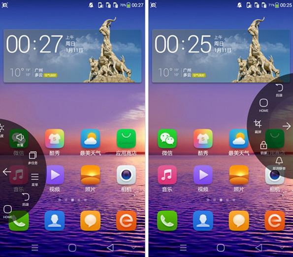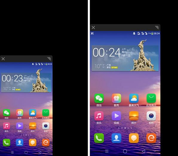 用户从屏幕的边缘快速地向中间滑动并折返滑出屏幕后,可以激活智能缩屏功能,而在这个功能当中,用户可以把操作界面缩小为合理的尺寸,为单手操作手机提供可行性。