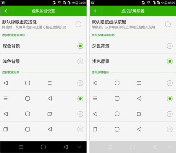 界面底部集成了虚拟按键,颜色有两种,且按键的排布有多种方案供用户选择。点击右边的小箭头可以隐藏虚拟按键,而向上滑动时可以重新调用。