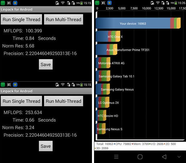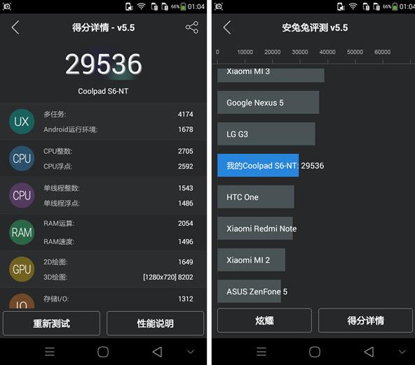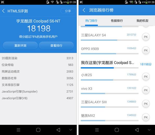 在鲁大师与安兔兔评测当中,ivvi S6的成绩表现排在中间位置,分数较配置相若的一些机型少,相信这与系统的固件优化尚待完善有关,期待厂家能在后期固件升级当中有所注意。