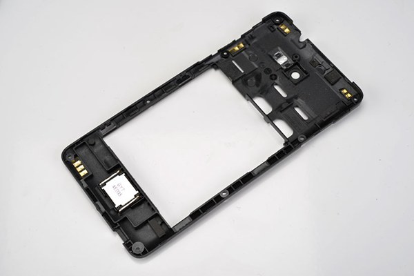 大神F1 Plus采用可拆卸后盖与电池设计,打开后盖就可以看到内部的双SIM卡槽和SD存储卡槽了。大神F1 Plus内部结构比较简单,采用螺丝加上卡扣的结构,如下图所示。