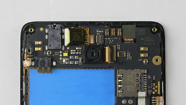 中兴红牛V5内部主板占据了绝大部分空间,也正因为如此,中兴红牛V5主板上的芯片集成度并不高,其顶部主要有前后摄像头、耳机等接口。