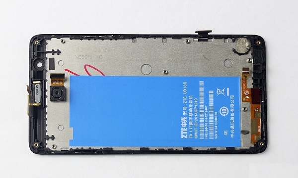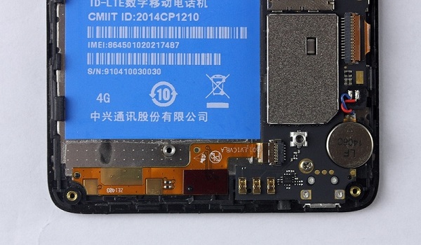 拆卸中兴红牛V5手机内部中框后,我们就可以看到中兴红牛V5内部结构了,另外在拆下来的中框内部上,我们还可以看到有一个扬声器等小部件。