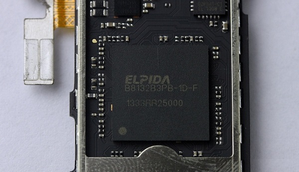 下面我们将中兴红牛V5内部主板正面上的芯片屏蔽罩取下,具体来看看其芯片组吧。首先看到的是尔必达1GB运行内存芯片(注:此次拆解的是青春版,能量版内置2GB内存)。另外值得一提的是在这颗内存芯片封装内部还有高通骁龙400系列MSM8226四核处理器芯片,由于集成在内存芯片下方,因此大家看不到。