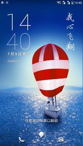 解锁方面,酷派大神Note采用了全屏滑动解锁模式,用户只需在屏幕空间区域任意滑动既可解锁。同时系统解锁界面还内置了快捷应用进入,只需将手指放置在应用上,通过滑动,便可以快捷进入应用程序。