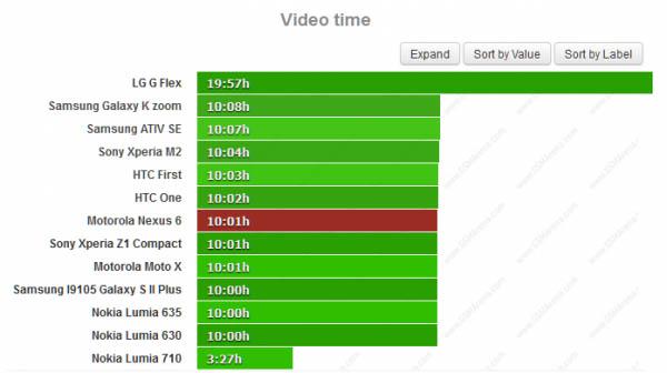 最后在连续视频播放环节:摩托罗拉的Nexus 6结果为10小时01分钟,作为比较摩托罗拉RAZR MAXX的续航时间为16小时35分钟,三星Galaxy Note4的续航时间为17小时25分钟,iPhone 6 Plus的续航时间为11小时15分钟。