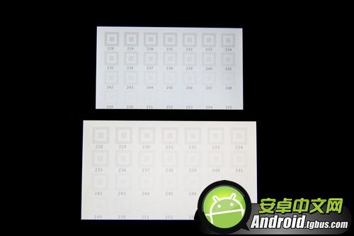 黑色饱和度方面魅蓝note表现出了压倒性的优势,可以清晰地看到1档儿红米手机2只到5;白色饱和则都可以勉强看清254。