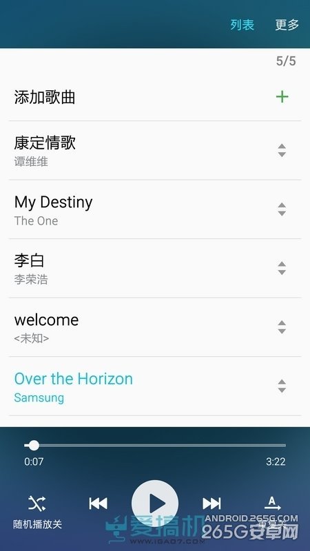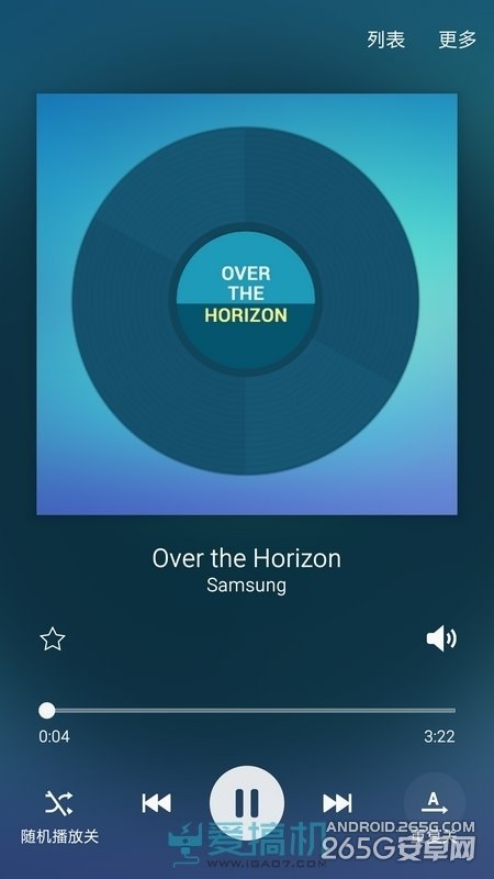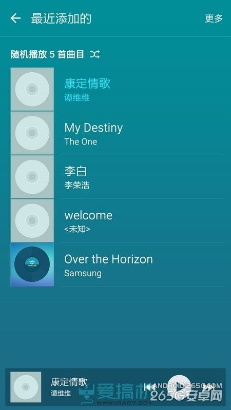 Galaxy S6的音乐播放应用采用了全屏蓝绿色的设计。