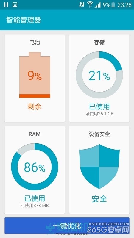 Galaxy S6加入了全新的“智能管理器”,这个管理器里面包含电源、储存、Ram和安全四项管理,和上文中的启动器插件是相连的,也包含一键优化功能。
